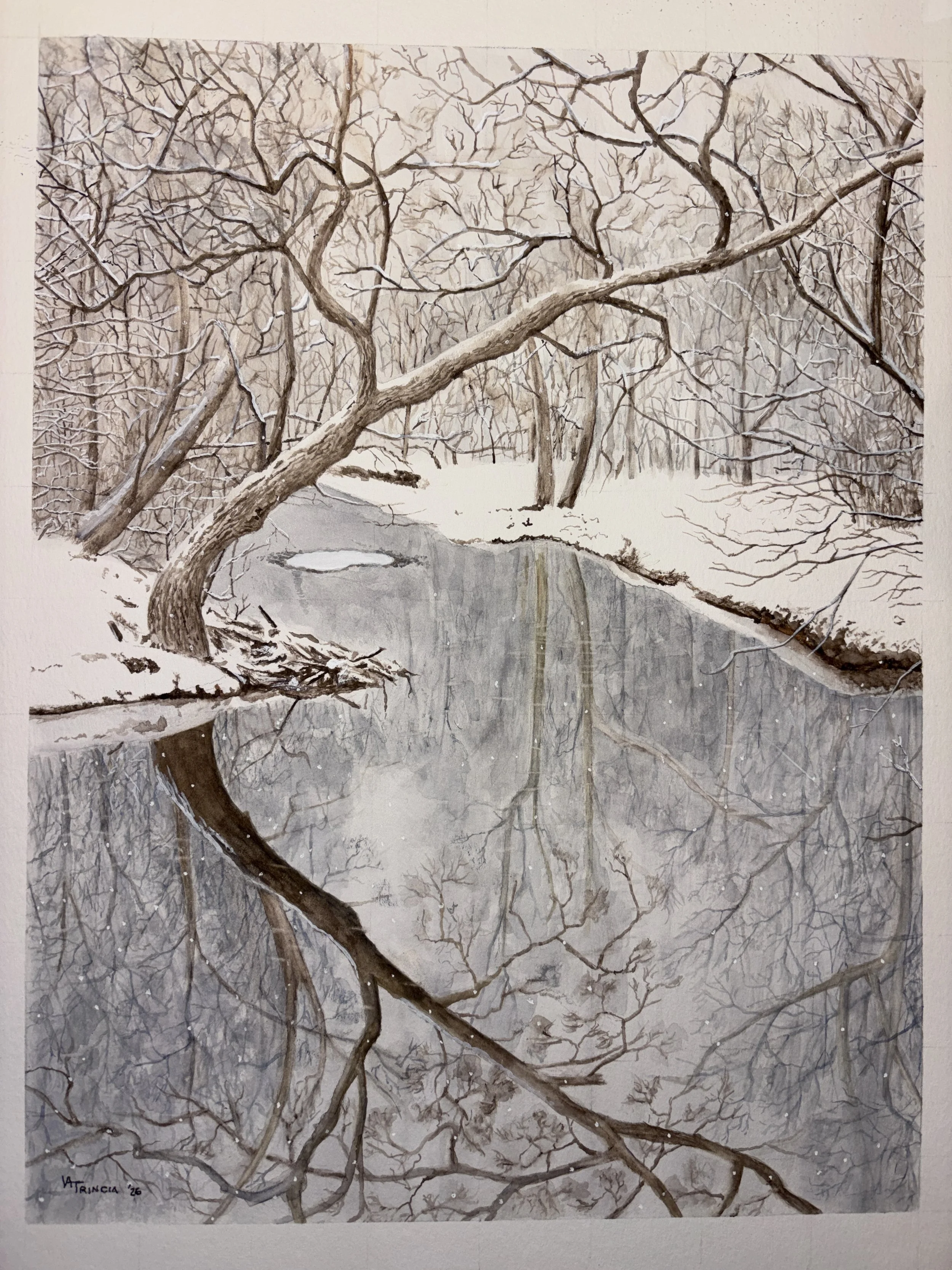“WINTRY MORNING AT FALLS ON BRANDYWINE CREEK” watercolor, image size 13.5”x17.5”, original & prints available (photo credit: Carol Lynn Thomas)