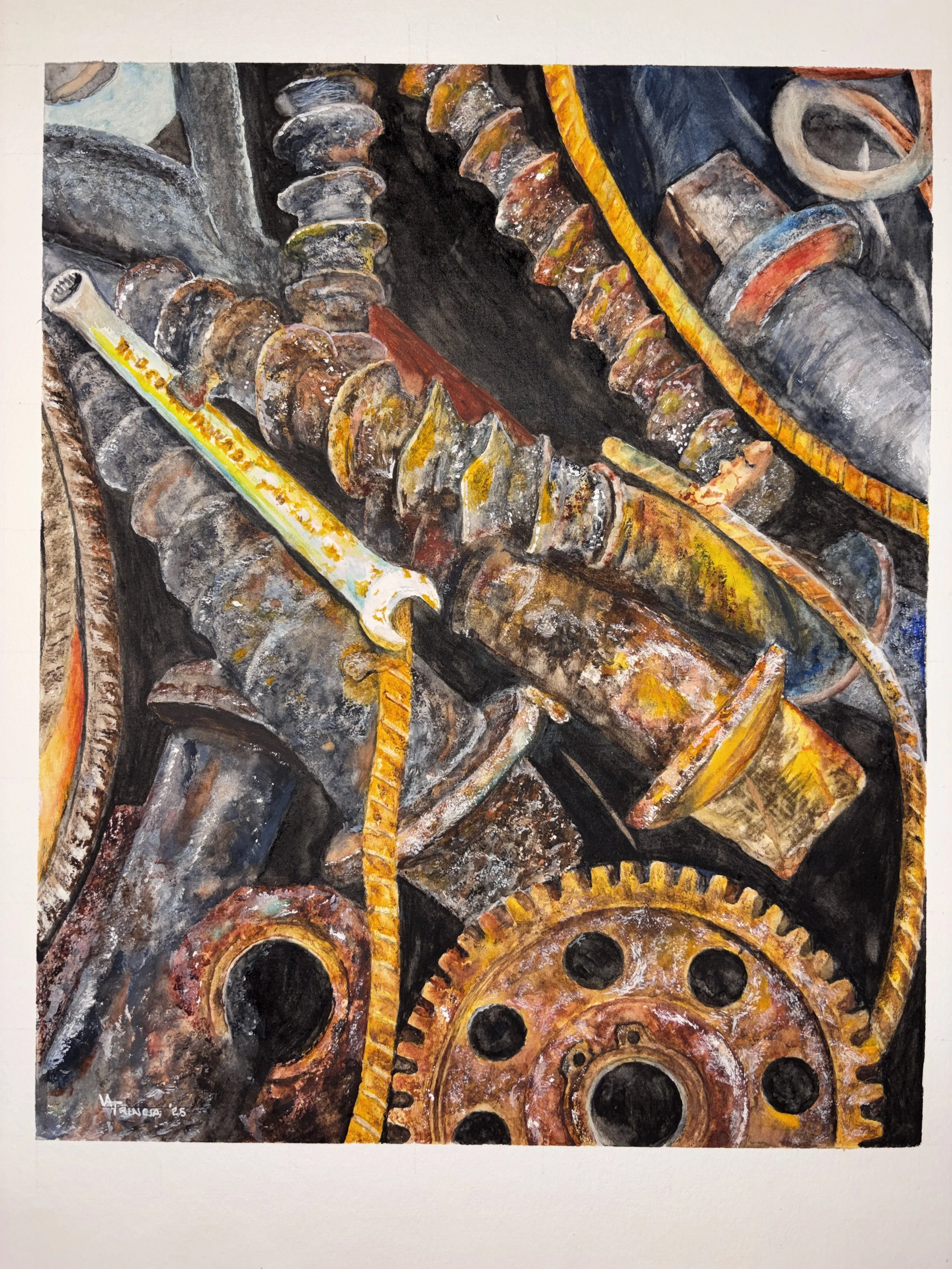 “IN NEED OF WD-40” No. 5, watercolor, image size 12”x14.5”, original & prints available. “Best Watercolor” Amateur Division at 2024 SC State Fair Fine Art Exhibition