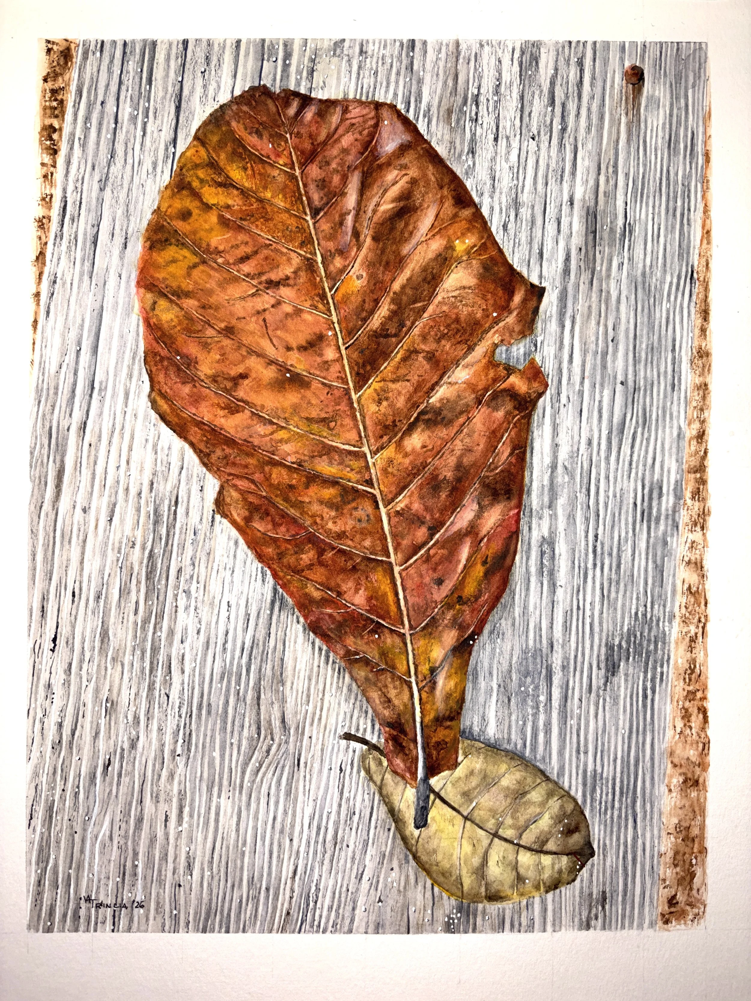 “FALLEN FIDDLE FIG LEAVES” watercolor, image size 9”x12”, original & prints available